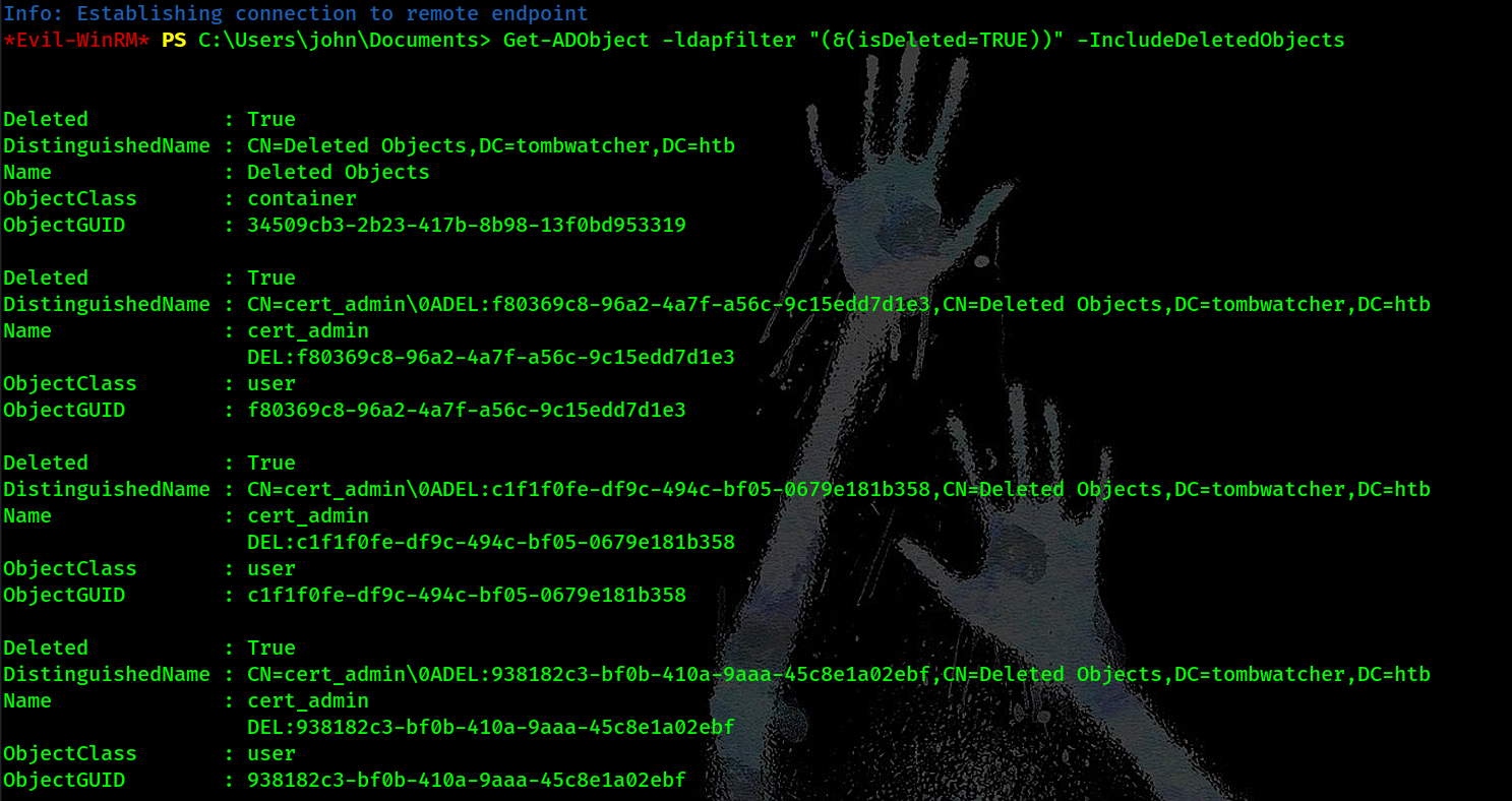 | *Evil-WinRM* PS C:\Users\john\Desktop> Get-ADObject -ldapfilter "(&(isDeleted=TRUE))" -IncludeDeletedObjects