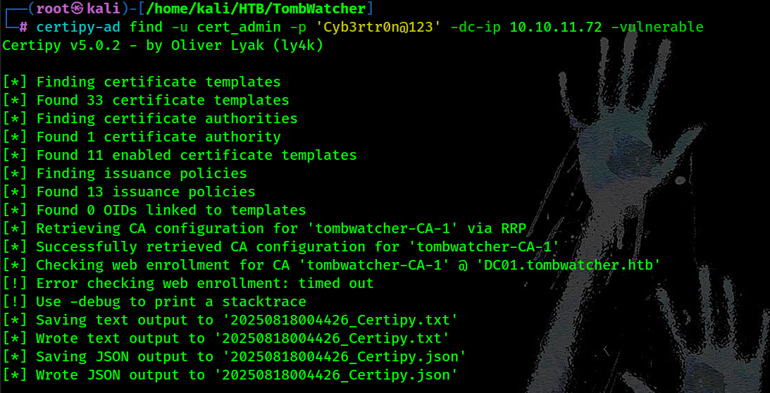 └─# certipy-ad find -u cert_admin -p 'Cyb3rtr0n@123' -dc-ip 10.10.11.72 -vulnerable