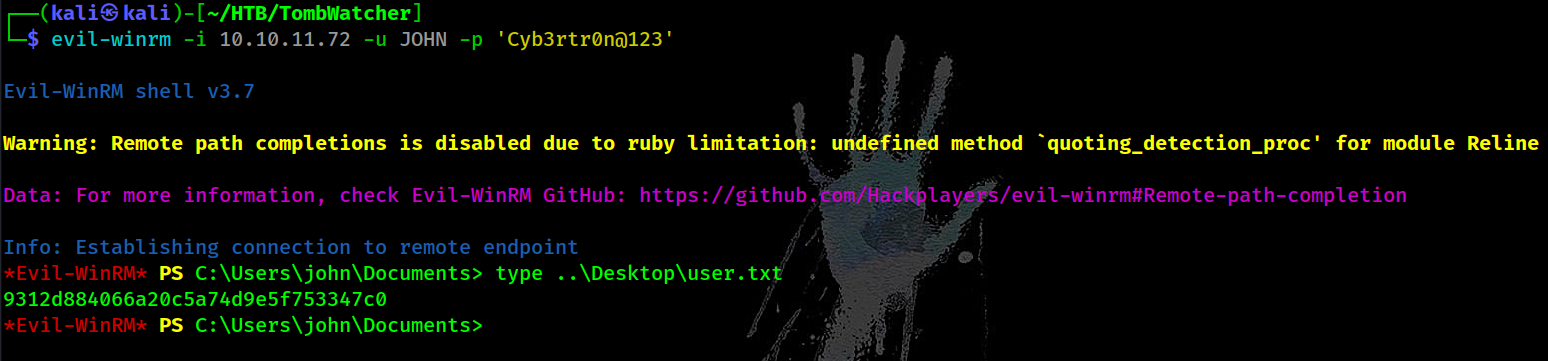 └─$ evil-winrm -i 10.10.11.72 -u JOHN -p 'Cyb3rtr0n@123'