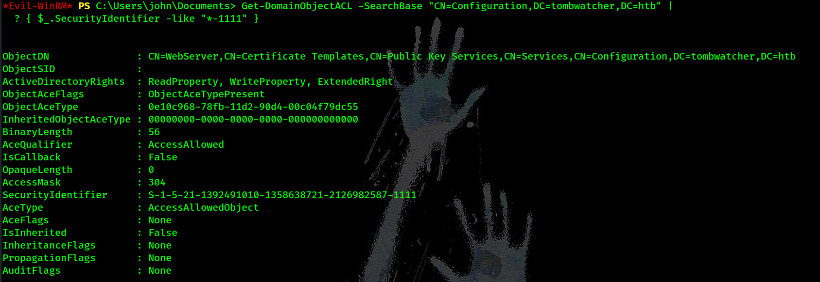 | *Evil-WinRM* PS C:\Users\john\Desktop> Get-DomainObjectAcl -Search "CN=Configuration,DC=tombwatcher,DChtb" | ? { $_.SecurityIdentifier -like "*-1111" }
