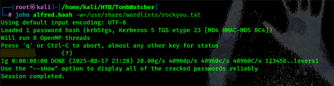 $krb5tgs$23$*Alfred$TOMBWATCHER.HTB$tombwatcher.htb/Alfred*$df223a219a24...<SNIP>...3b0d09